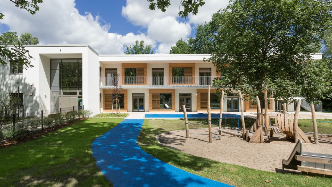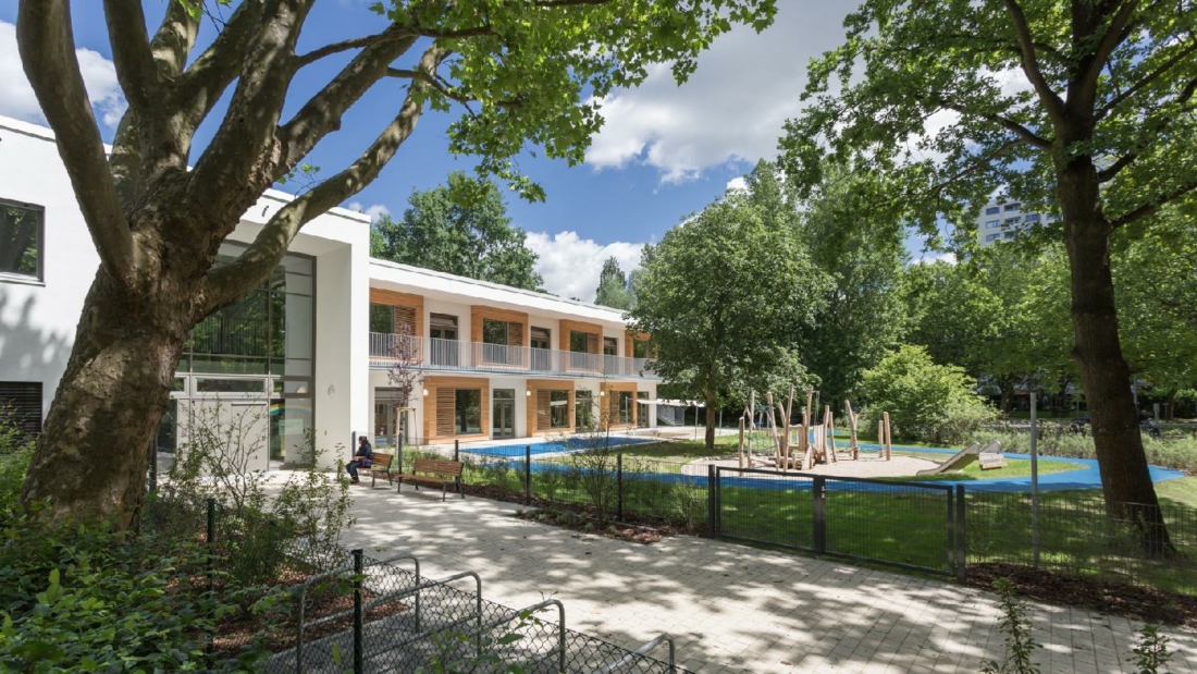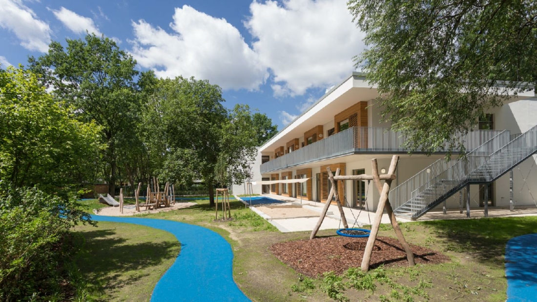 Im Erdgeschoss wurden für die Kleinkinder des Krippenbereichs Kunststoff- und Sandspielflächen direkt vor ihrer Terrasse angelegt. Diese Spielflächen bilden zugleich eine “kleine Barriere“ zum offenen Garten im Süden des Gebäudes. Hier laden Rasenflächen und eine großzügige Spielwiese auch die Kinder aus dem Kindergartenbereich des Obergeschoss zum Spielen ein. Umgeben ist die Spielwiese von einem geschwungenen Rundweg aus farbigen Kunststoff. In einem Nutzgarten können die Kinder selbst gärtnern und gestalten. Eine schattige Liegewiese mit bunten Picknicktischen, Hängematten und Sitzbänken bietet vielfältige Möglichkeiten zum Ausruhen und Entspannen. Zu den öffentlichen Grünflächen am Fasaneriegraben gibt es einen direkten Zugang über einen Nebeneingang.