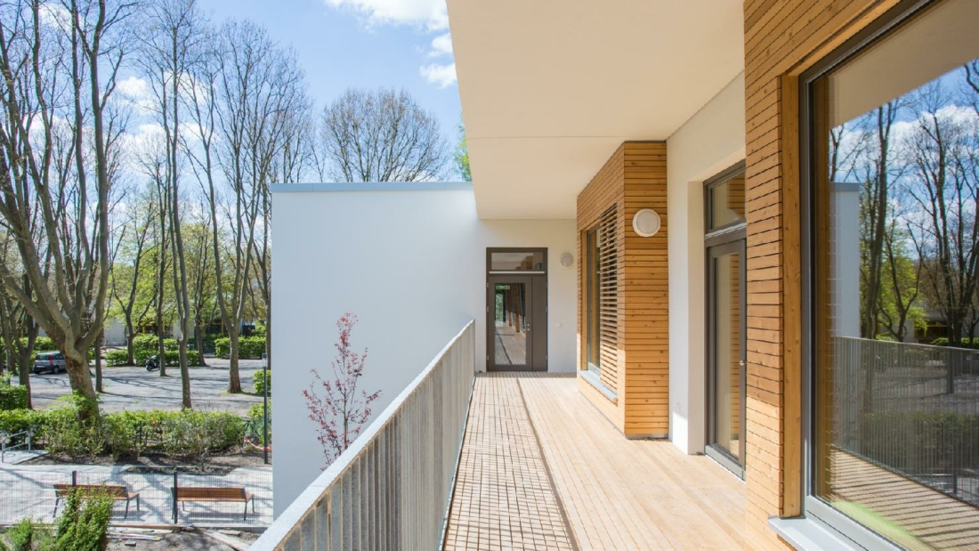 Über eine großzügige, zentrale Eingangsachse gelangt man von der Straße direkt zum Haupteingang der Kita. Der Neubau ist ebenerdig und barrierefrei erschlossen. Ein zweigeschossiges Foyer empfängt Eltern, Kinder und Besucher. Alle Gruppenräume im EG und 1.OG sind linear aneinander gereiht und bilden die klare, übersichtliche Kernzone des Gebäudes. Die EG Gruppenräume orientieren sich zum Garten und verfügen über großzügige, überdachte Terrassenbereiche. Im 1. OG bietet ein überdachter Laubengang vor den Gruppenräumen ebenfalls Spielflächen im Außenbereich.