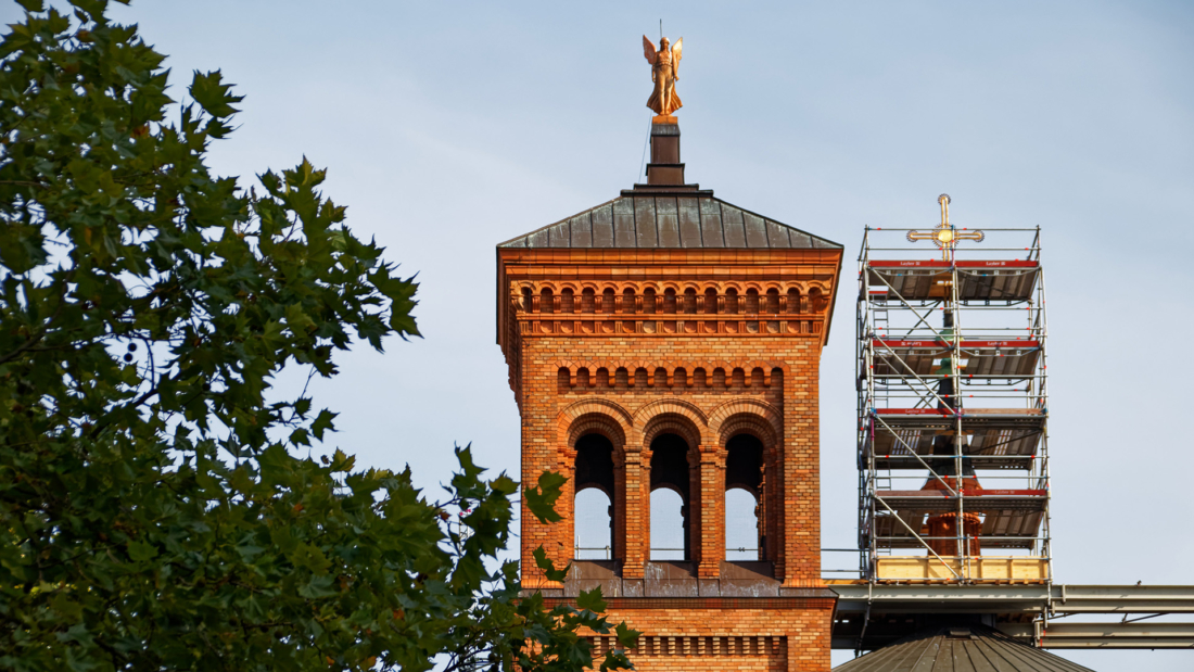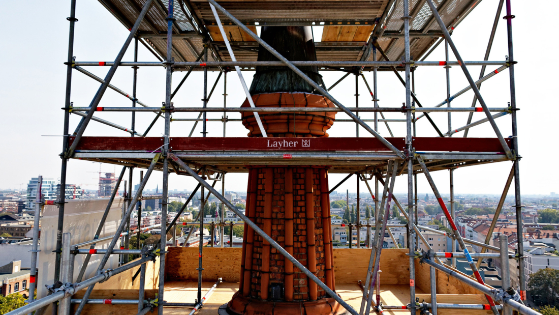 Ein bedeutender Teil der Maßnahme wird durch die Gerüstbauarbeiten bestimmt. Vorbereitend muss ein statisches Konzept zur Gerüstkonstruktion erstellt werden. Dieses Konzept sieht eine Brückenkonstruktion vor, die über dem Tambour montiert wird. Die Laterne selbst wird mit einer freistehenden Gerüstkonstruktion bis zur Turmspitze eingerüstet. Der Zugang zur Laterne ist über Aufzüge und die Zugangsbrücken möglich.