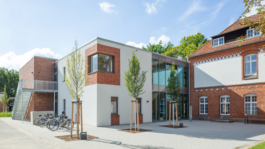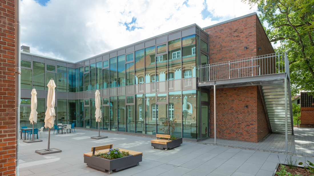 Der 2-geschossige Ergänzungsneubau wird parallel in einem Abstand von ca. 9 m zur Südostfassade des Katharinenhauses errichtet. Zwischen dem Funktionsriegel bzw. Zimmertrakt und dem Katharinenhaus schafft ein neuer Verbindungsbau die minimal notwendige Anknüpfung an den Bestand. Die Anordnung der Gebäude erlaubt die Ausbildung eines dreiseitig umschlossenen Innenhofes. Der Hof öffnet sich Richtung Südwesten. Die Innenräume erhalten dadurch einen großzügigen Lichteinfall mit einer angenehmen, gastfreundlichen und hellen Atmosphäre. Der Innenhof bietet in der Gestaltung Raum für einen geschützten Aufenthalt der Gäste im Freien und lädt zur Veranstaltung von vielfältigen Aktivitäten wie Weihnachtsmärkten, kleinen Festen, Gottesdiensten etc. ein.