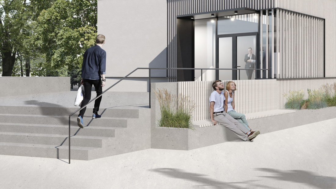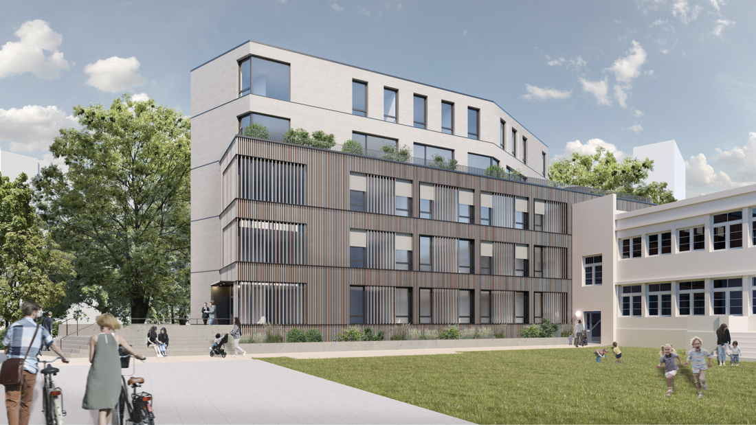 Die Außenanlagen zwischen Neubau, Kita und Kirche werden für gemeinschaftliche Nutzungen neu gestaltet. Die Kita erhält außerdem noch eine Ersatzfläche.