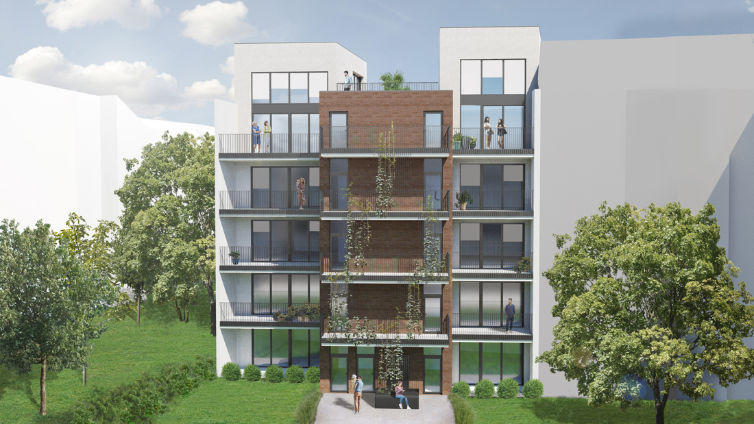 Im Hinterhof eines Grundstücks in Prenzlauer Berg wird ein fünfgeschossiges Mehrfamilienhaus mit Keller- und Dachgeschoss geplant. Insgesamt entstehen neun Wohneinheiten mit einer Wohnfläche von 68 – 136 m². Jede WE erhält zwei Balkone bzw. Loggien. Der Zugang zum geplanten Hinterhaus erfolgt über den Hauseingang des Vorderhauses.